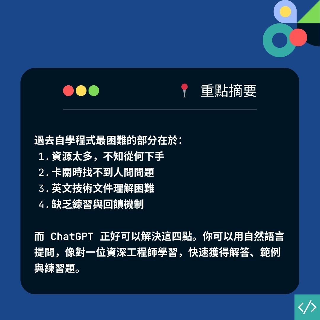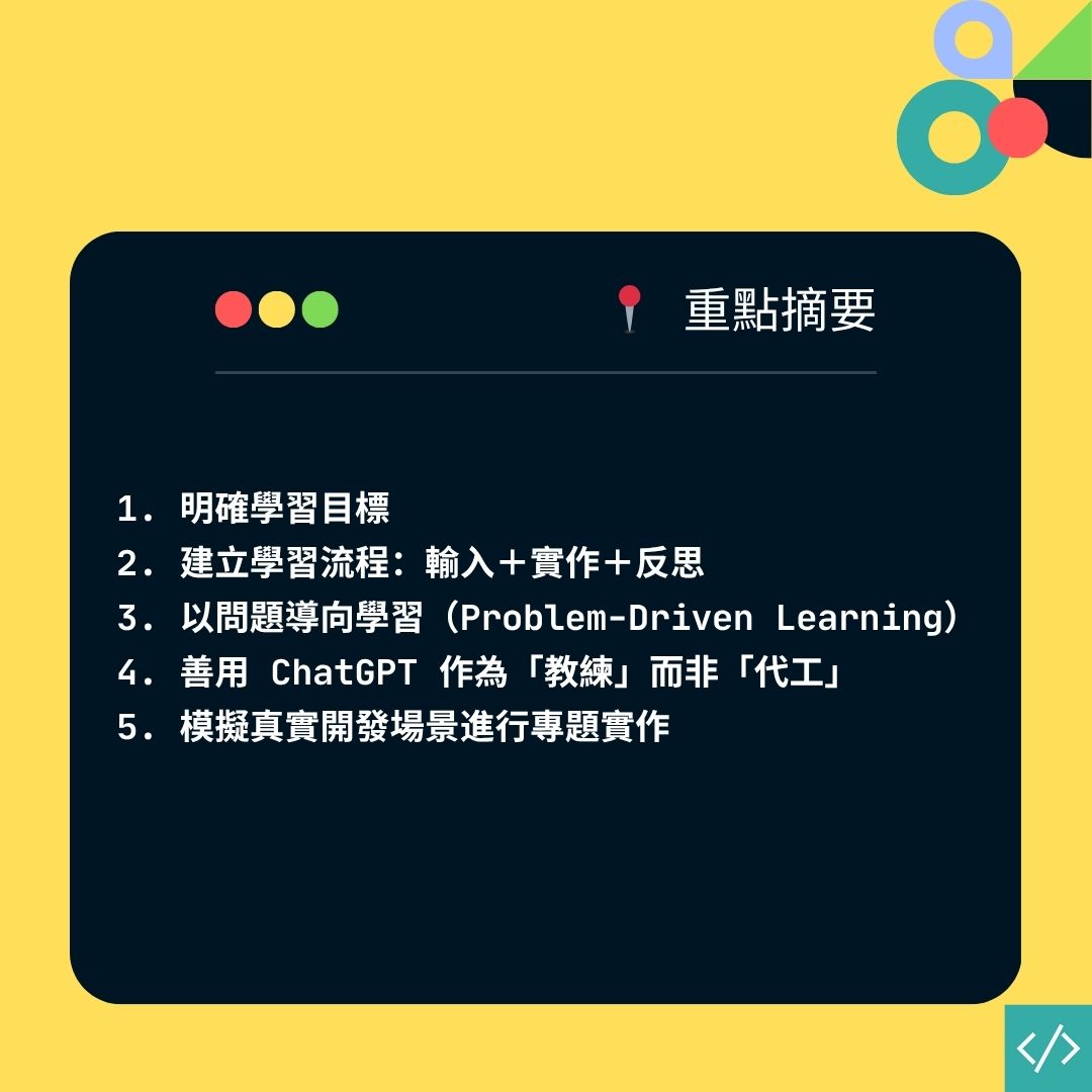 • 主動問問題:任何看不懂的語法、邏輯、錯誤訊息都可以問 AI