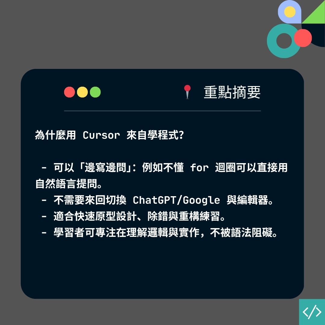 無論你是程式設計初學者、職涯轉職者,或是希望精進特定語言技巧的開發者,使用 Cursor 都能有效提升學習效率與成效。建議搭配一個實際專案(如 Todo App、API Server)作為學習主軸,在實作中成長,在 AI 引導下理解設計背後的邏輯。